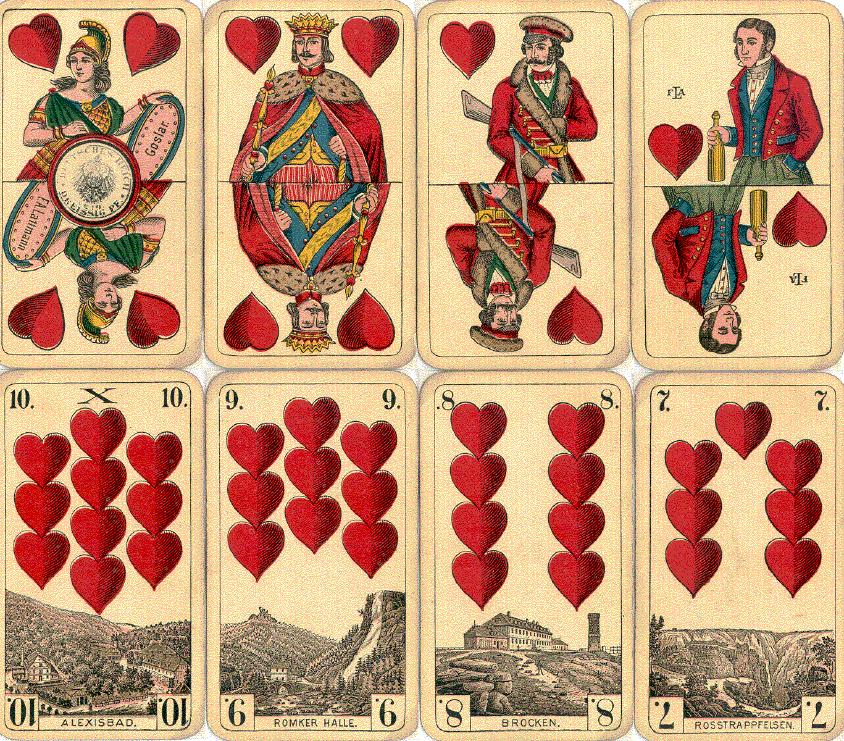 Die Dause und Bildkarten entsprechen dem üblichen doppelfigurigen preussischen Standardbild, die Zahlenkarten zeigen Ansichten aus dem Harz. Lattmann hat vorher und nachher ähnliche Spiele hergestellt, bei denen aber abweichende Harz-Ansichten gezeigt werden.