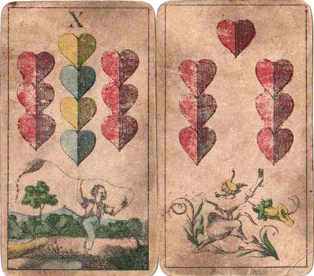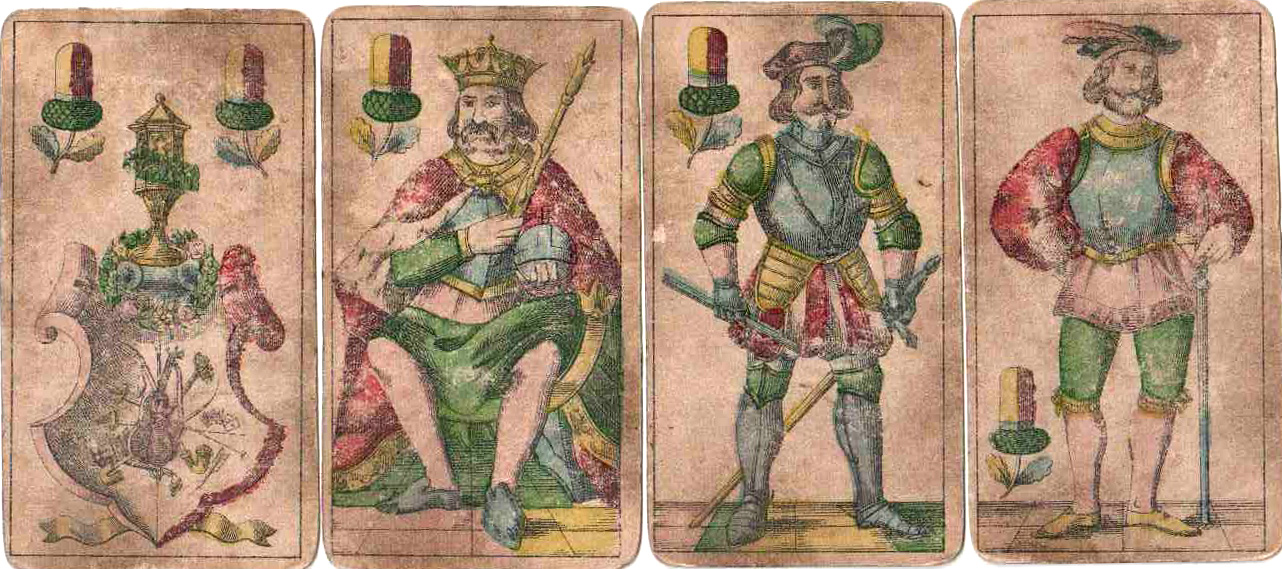 Typisch für dieses Bild sind die Daus-Karten, bei denen auf den Schilden symbolische Darstellungen sind: