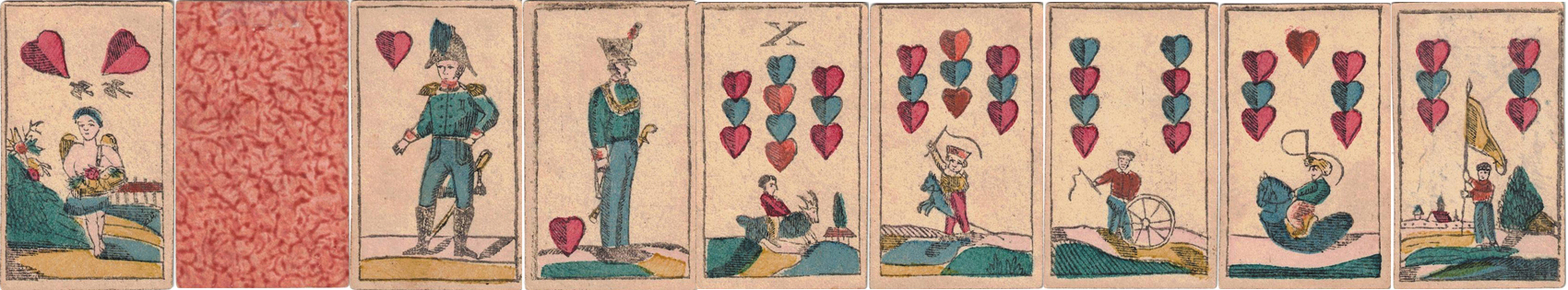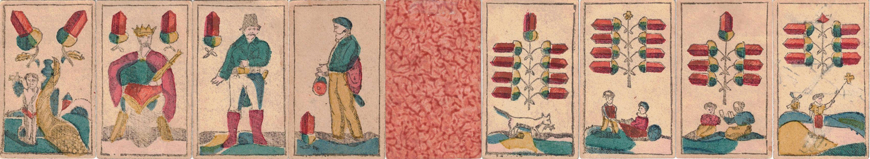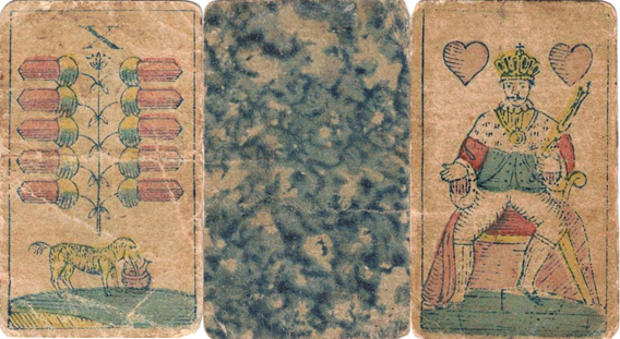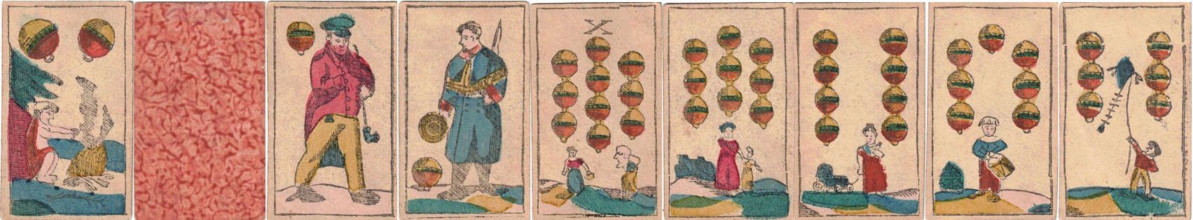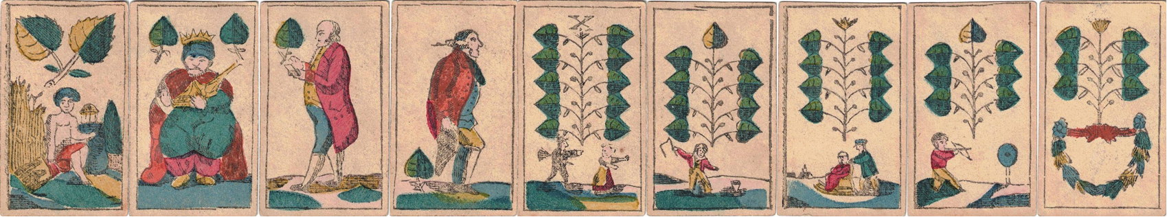 This pack was made c. 1840 in Germany, the maker is not known. His name had originally been on the Six of Leaves, but it has been removed.