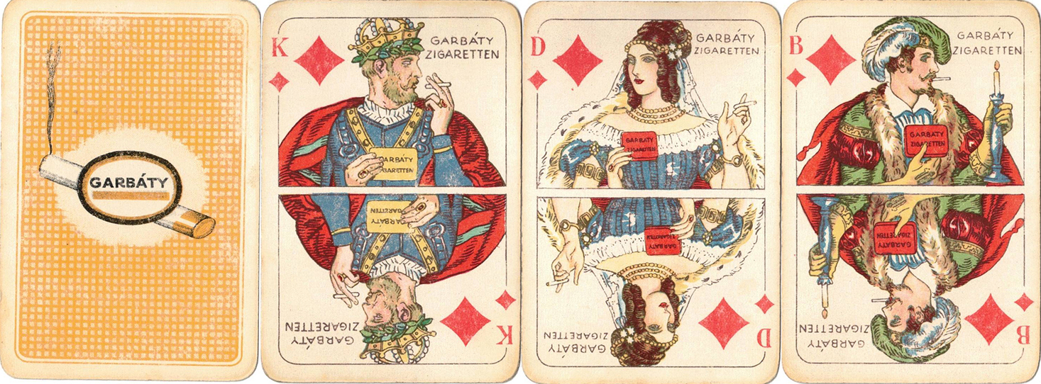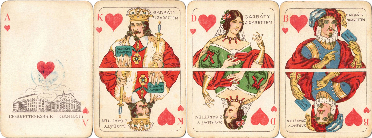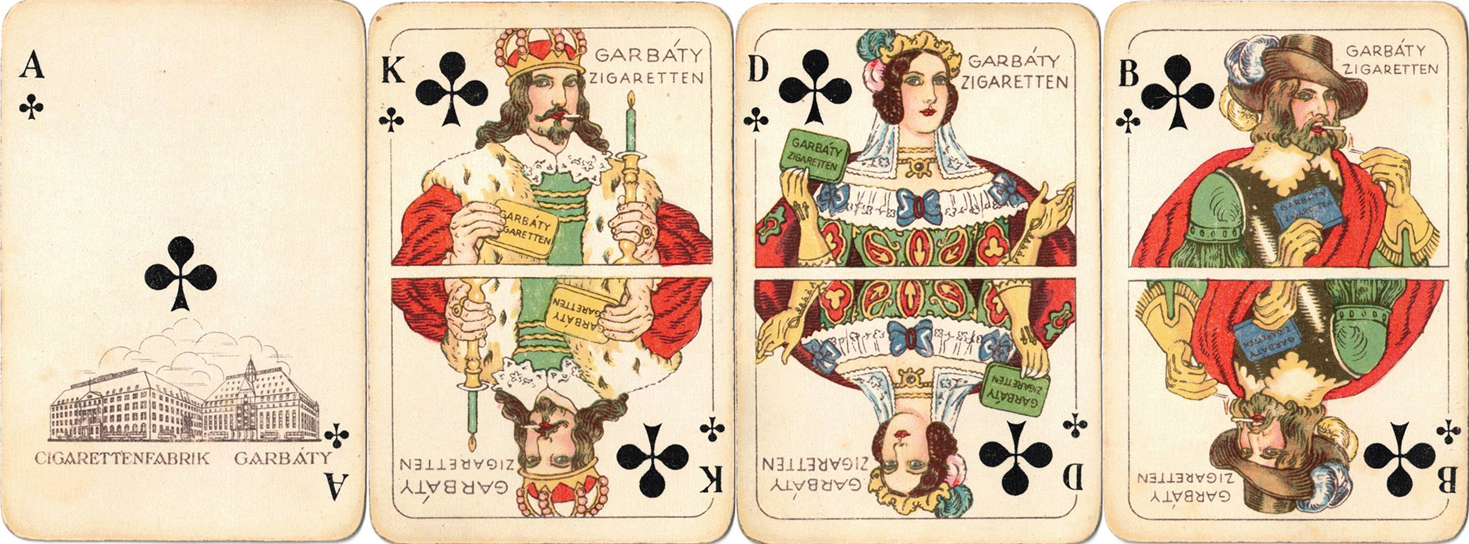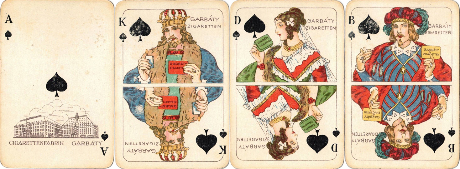 On first sight, the court cards look like those of the Berlin pattern, but actually they are all modified to be smokers, and they also hold advertising for Garbáty cigarettes in their hands. On all court cards is 'Garbáty Zigaretten'. On the Aces is a picture of the Garbáty factory.
