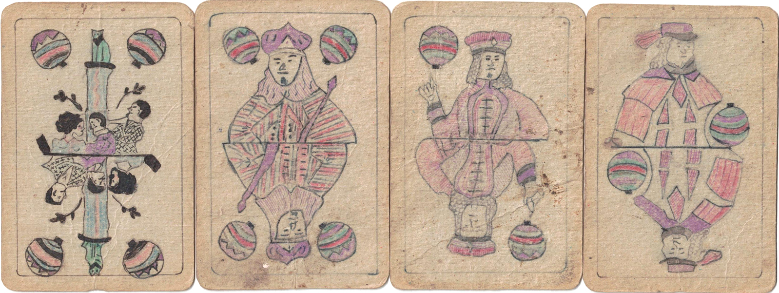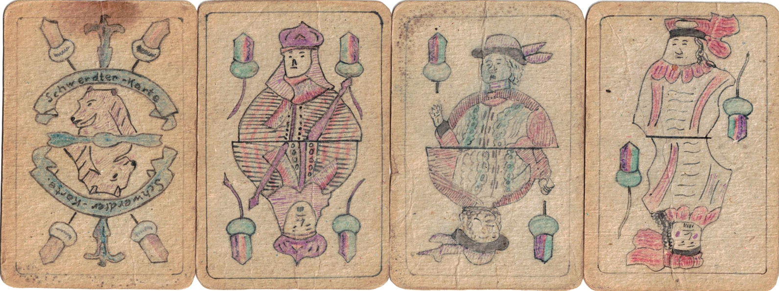 The pack is a so-called Schwerdter-Karte, cards with German suits and the Saxon standard pattern. It is a pity that the King of Leaves is missing. I am showing the back in its place.