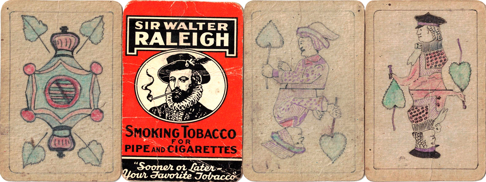 These backs are made from packages of Sir Walter Raleigh tobacco which has been sold since 1927. So the cards are definitely not from WWI. As the pack is a typical German pack I assume that the cards were made by a German PoW. What surprises me is that the tobacco was in a cardboard box, normally it was sold in a tin box (which had the same design at that time).
